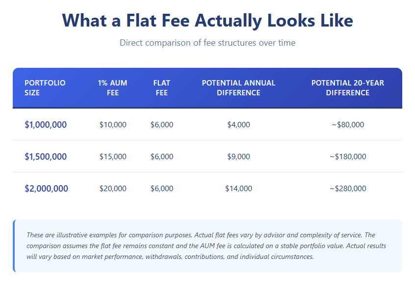 The potential difference between paying 1% AUM fees and a $6,000 annual flat fee could range from $4,000 to $14,000 annually, depending on your portfolio size. Over a 20-30 year retirement, that potential difference could reach $80,000 to $400,000 or more, though actual results will vary based on many factors including market performance, withdrawals, and fee adjustments over time.