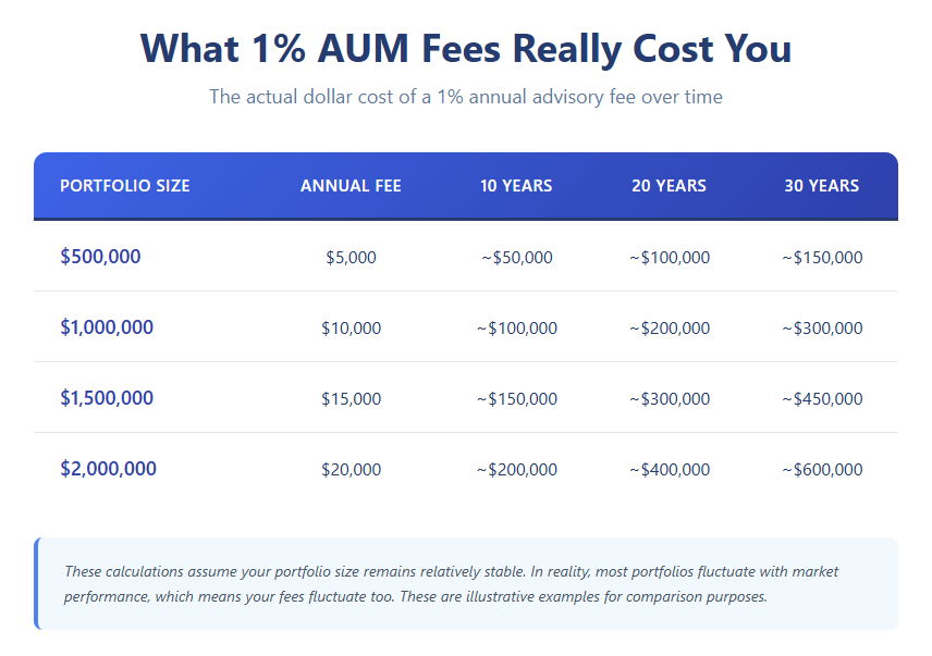 Numbers make this clearer than any argument I could make. Here's what a 1% AUM fee actually costs in real dollars over time.